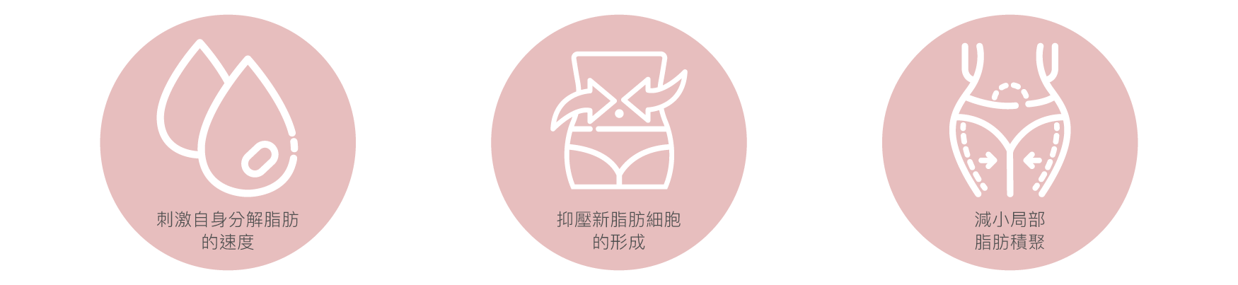 激活AMPK酶、PKA酶及ERK酶,透過磷酸化作用,分解脂肪顆粒,令脂肪細胞溶解成不同物質,被身體代謝掉,從而減少脂肪,並控制脂肪生成。多肽成分還會刺激膠原再生,讓脂肪消失後的皮膚不會凹陷、褶皺。